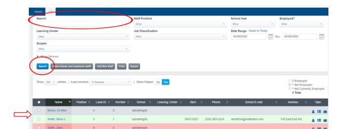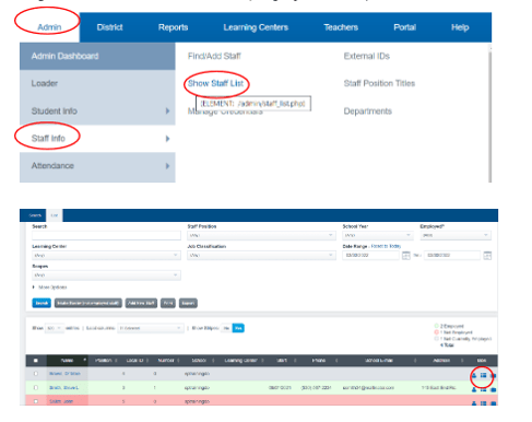 - Next, navigate to Admin > Staff Info > Show Staff List. Here, you’ll see a list of staff members. Click the Suitcase Icon (Employment Icon) next to the new staff member’s name to open their employment details.