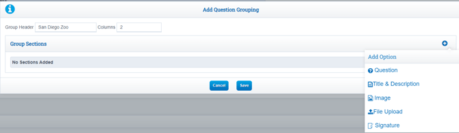 - Question Group Option Sample: allows you to put more than one question on a row(see sample below of letter preview) EX: Student Information (First, Last Name) Parent Information ( Email, Address).