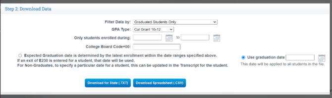Expected Graduation Date: Based on data in the SystemOrUse Graduation Date: Input a Graduation date to be applied for all studentsChoose to download for the State or in a csv for your own viewing purposes.
