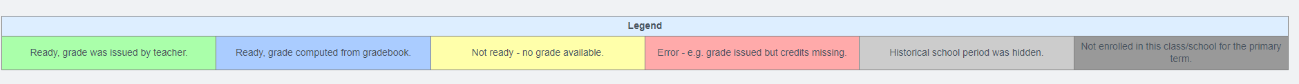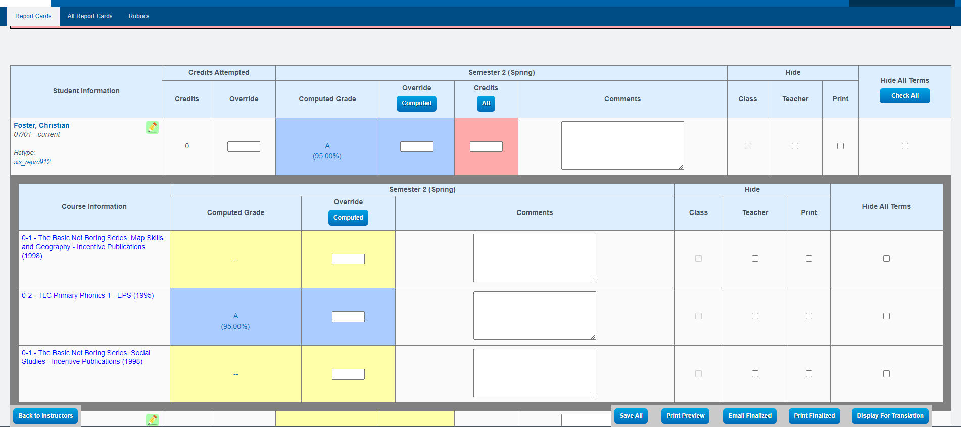 If grades are not coming over from the grade book, you will see a red warning at the top of the page. Manually enter the final report grade in the “Override” column. If the grade is coming over from the gradebook, you can also override to change the report card grade