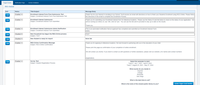 - Your school has the option to set up various Reg Online Trigger Emails, with the initial ones on the list designed for the Enrollment Interest Form. These Trigger Emails are detailed in the Enrollment Interest Form User Guide: